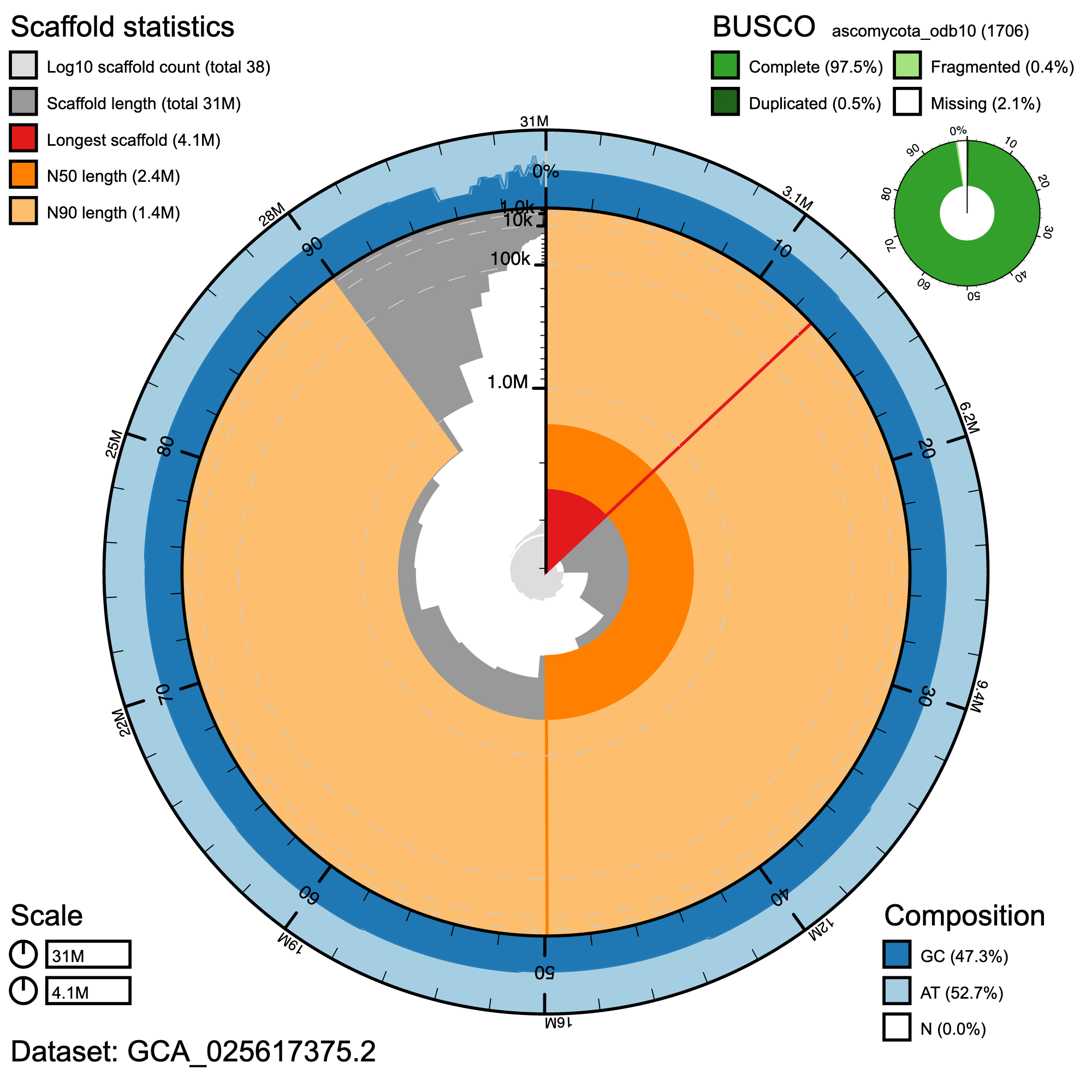 BlobToolKit Snailplot showing N50 metrics for A. socialis assembly glAcaSoci1 and BUSCO scores for the Ascomycota set of orthologues.