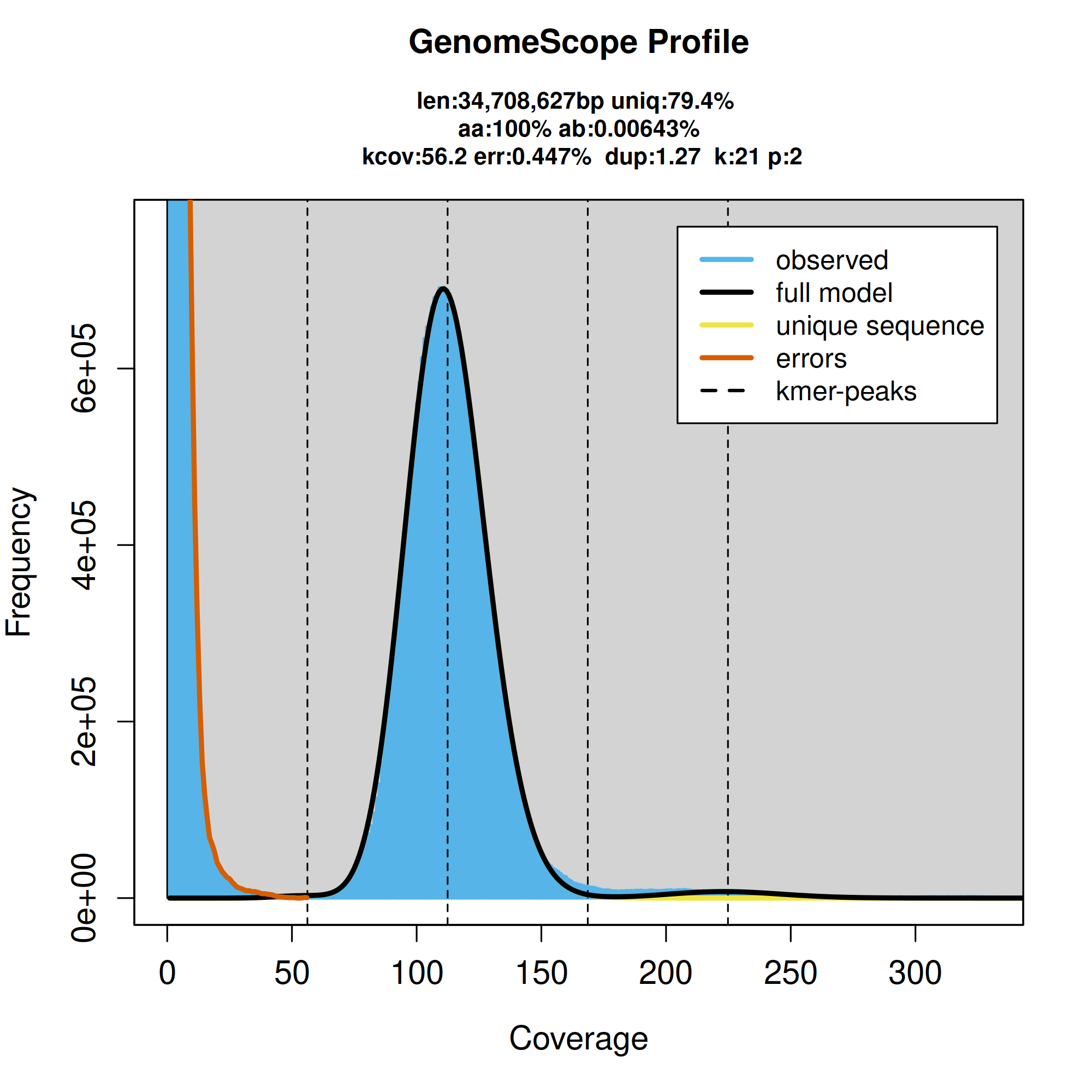 K-mer spectra output generated from PacBio HiFi data without adapters using GenomeScope2.0.