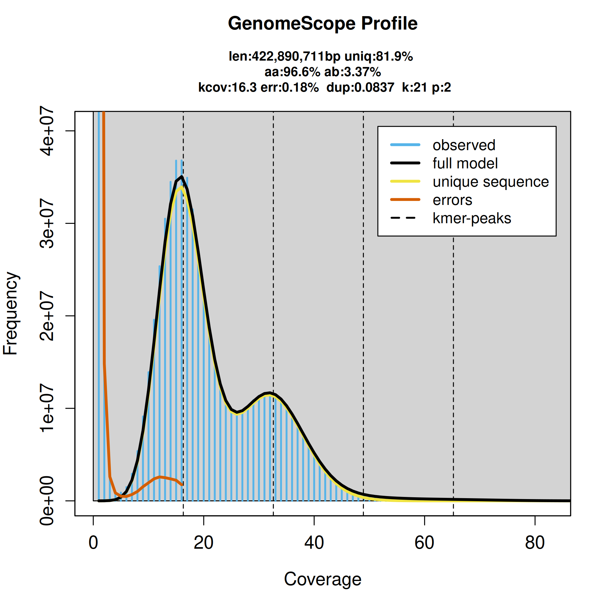 K-mer spectra output generated from PacBio HiFi data without adapters using GenomeScope2.0. The bimodal pattern observed corresponds to a diploid genome and the k-mer profile matches that of high (>1%) heterozygosity. K-mers covered at lower coverage and high frequency correspond to differences between haplotypes, whereas the higher coverage and lower frequency k-mers correspond to the similarities between haplotypes.