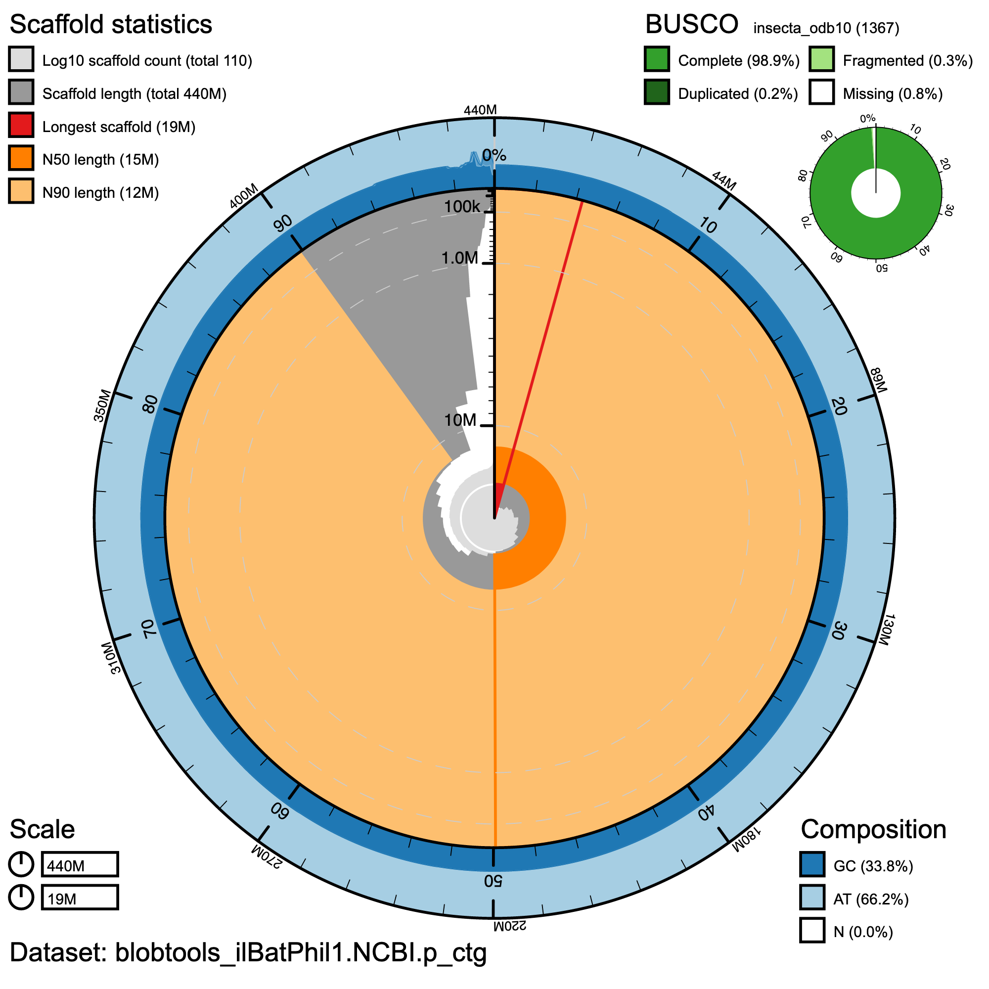 BlobToolKit Snail plot showing a graphical representation of the quality metrics for the B. philenor hirsuta primary assembly (iBatPhil1.NCBI.p_ctg). The plot circle represents the full size of the assembly. From the inside-out, the central plot covers length-related metrics. The red line represents the size of the longest scaffold; all other scaffolds are arranged in size-order moving clockwise around the plot and drawn in gray starting from the outside of the central plot. Dark and light orange arcs show the scaffold N50 and scaffold N90 values. The central light gray spiral shows the cumulative scaffold count with a white line at each order of magnitude. White regions in this area reflect the proportion of Ns in the assembly; the dark versus light blue area around it shows mean, maximum, and minimum GC vs. AT content at 0.1% intervals (Challis et al. 2020).