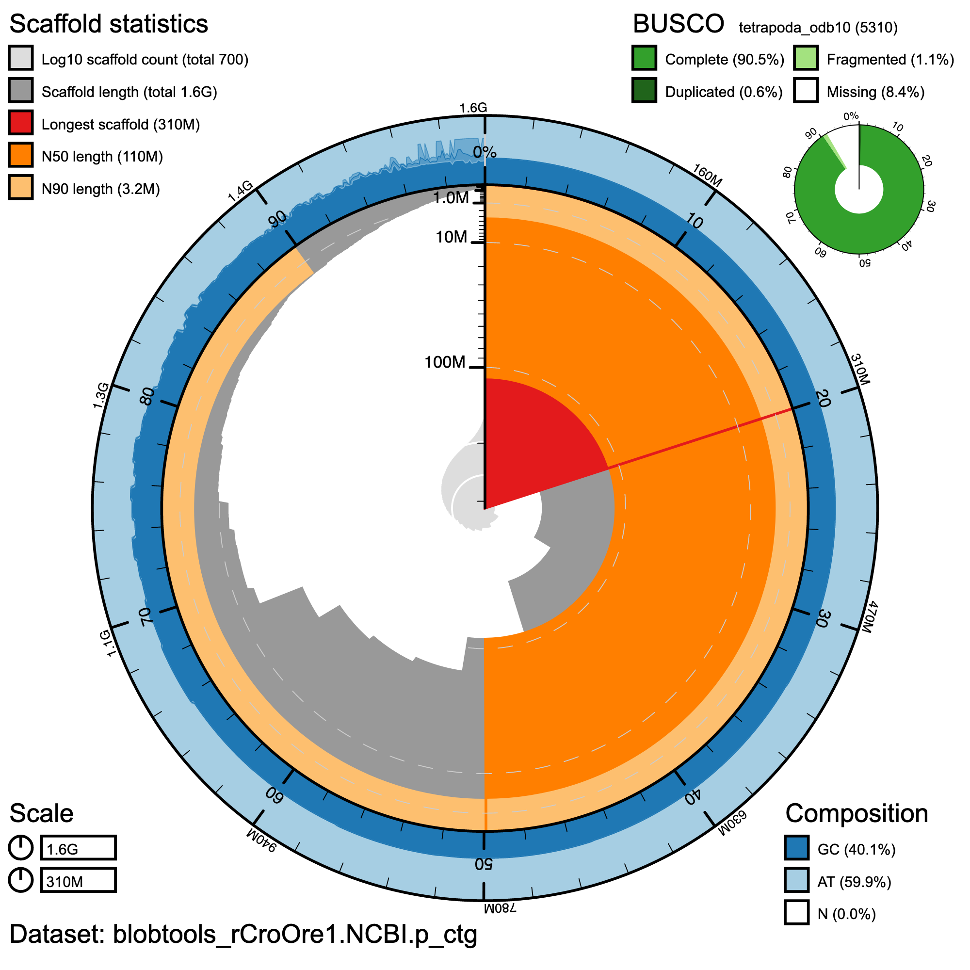 BlobToolKit Snail plot showing a graphical representation of the quality metrics for the C. oreganus helleri primary assembly (rCroOre1). The plot circle represents the full size of the assembly. From the inside-out, the central plot covers length-related metrics. The red line represents the size of the longest scaffold; all other scaffolds are arranged in size-order moving clockwise around the plot and drawn in gray starting from the outside of the central plot. Dark and light orange arcs show the scaffold N50 and scaffold N90 values. The central light gray spiral shows the cumulative scaffold count with a white line at each order of magnitude. White regions in this area reflect the proportion of Ns in the assembly. The dark vs. light blue area around it shows mean, maximum and minimum GC vs. AT content at 0.1% intervals (Challis et al. 2020).
