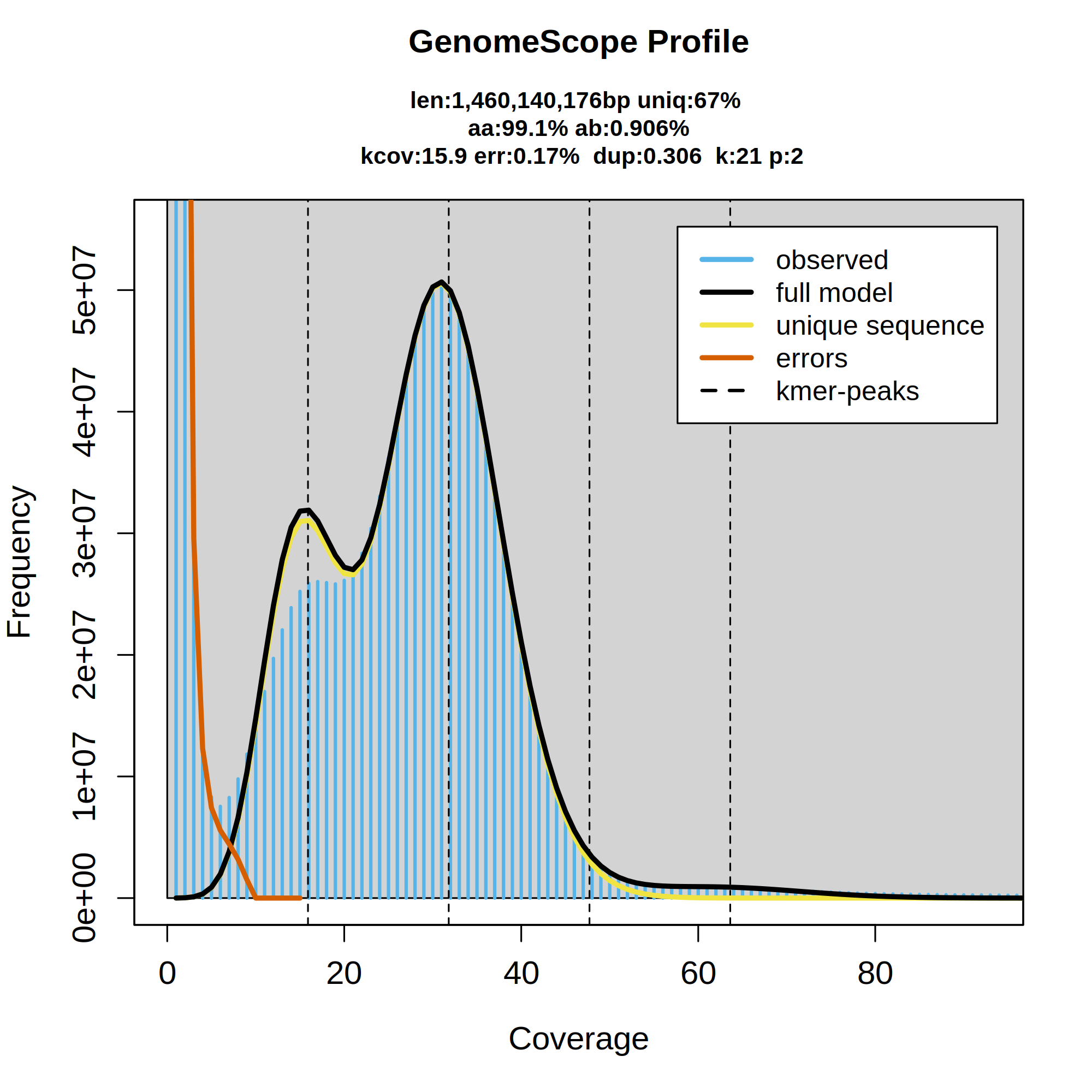 K-mer spectra output generated from PacBio HiFi data without adapters using GenomeScope2.0. The bimodal pattern observed corresponds to a diploid genome. K-mers covered at lower coverage and lower frequency correspond to differences between haplotypes, whereas the higher coverage and higher frequency k-mers correspond to the similarities between haplotypes.