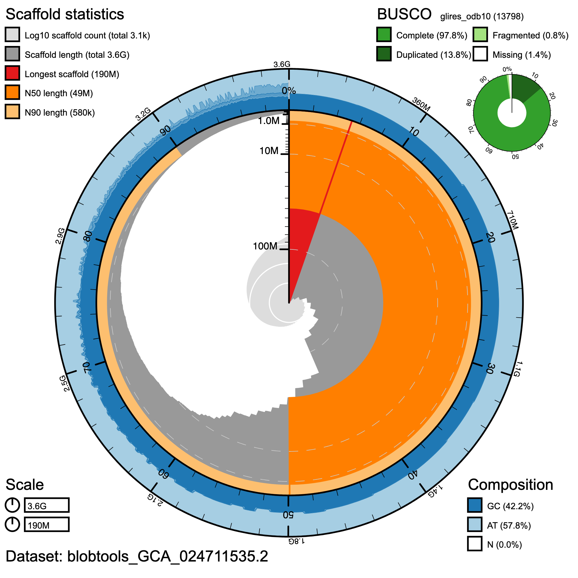 Snail plot summary visual of D. merriami primary assembly quality generated with BlobToolKit (Challis et al. 2020). Central circular plot represents the entire length of the genome, with scaffolds added in clockwise fashion from longest to shortest. The outer ring indicates relative AT/CG content, and scaffold summary statistics and BUSCO scores are shown at top left and right.