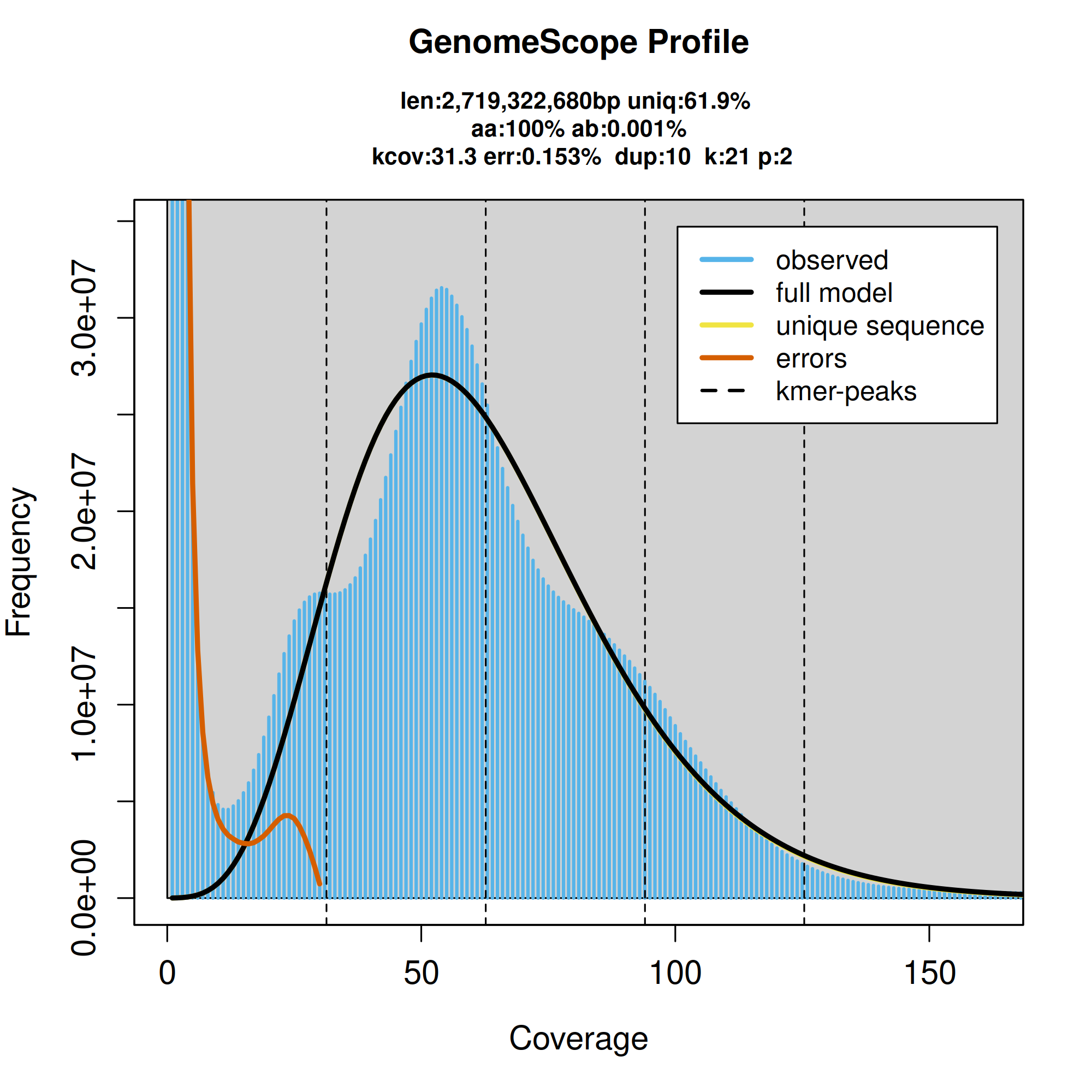 GenomeScope2.0 k-mer spectrum from adapter-trimmed HiFi sequence data.