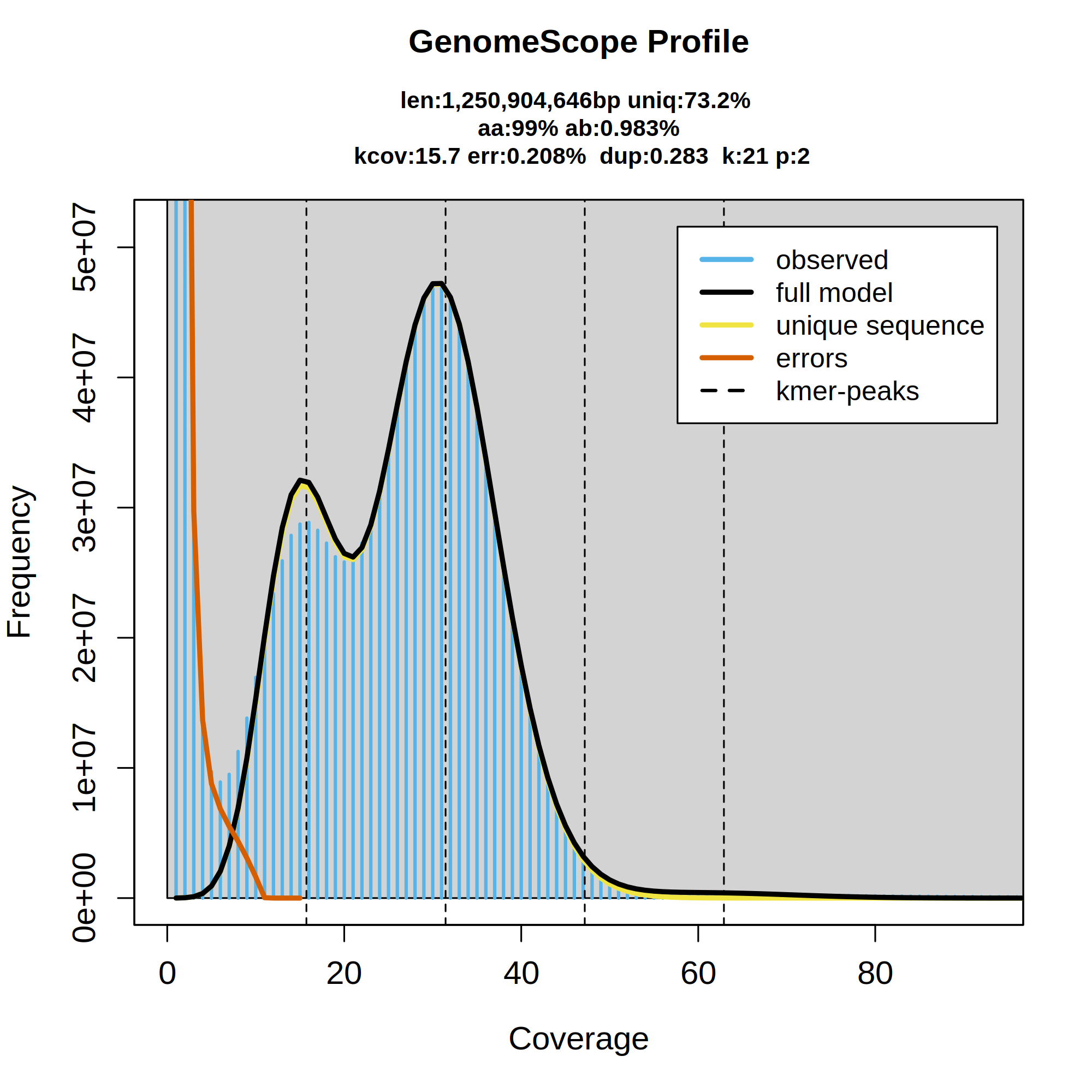 K-mer spectrum output generated from PacBio HiFi data without adapters using GenomeScope 2.0. The bimodal pattern observed corresponds to a diploid genome. K-mers covered at lower coverage and lower frequency correspond to differences between haplotypes, and the higher coverage and higher frequency k-mers correspond to the similarities between haplotypes.