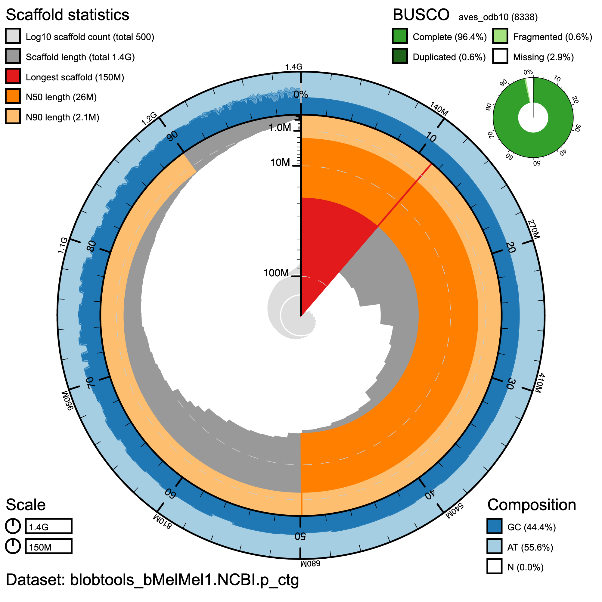 BlobToolKit Snail plot showing a graphical representation of the quality metrics for the Melospiza melodia primary assembly (bMelMel1.0.p). The plot circle represents the full size of the assembly. From the inside-out, the central plot covers length-related metrics. The red line represents the size of the longest scaffold; all other scaffolds are arranged in size order moving clockwise around the plot and drawn in gray starting from the outside of the central plot. Dark and light orange arcs show the scaffold N50 and scaffold N90 values. The central light gray spiral shows the cumulative scaffold count with a white line at each order of magnitude. White regions in this area reflect the proportion of Ns in the assembly The dark versus light blue area around it shows mean, maximum and minimum GC versus AT content at 0.1% intervals (Challis et al. 2020).