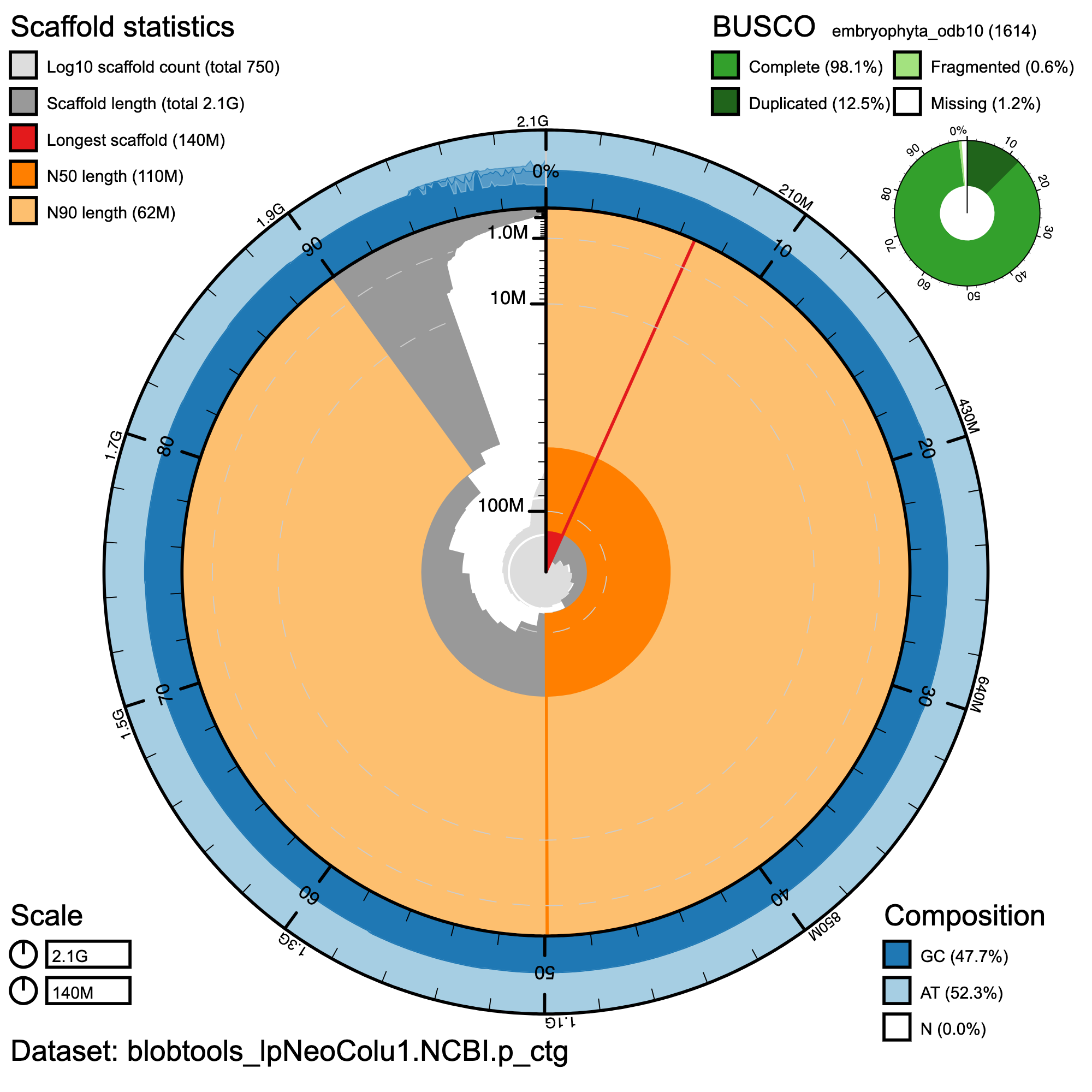 Omni-C interaction heatmaps are shown for haplotype 1 (left) and haplotype 2 (right) assemblies at 10 kb resolution, visualized at a current resolution of 5.12 mb. Each heatmap reflects chromatin interaction frequency, with darker shades representing higher contact intensity. Strong diagonal patterns and distinct chromosomal interaction blocks indicate well-assembled, chromosome-scale scaffolds. The maps support the structural integrity of both assemblies and highlight the continuity and organization of genomic regions in the lpNeoColu1 genome.