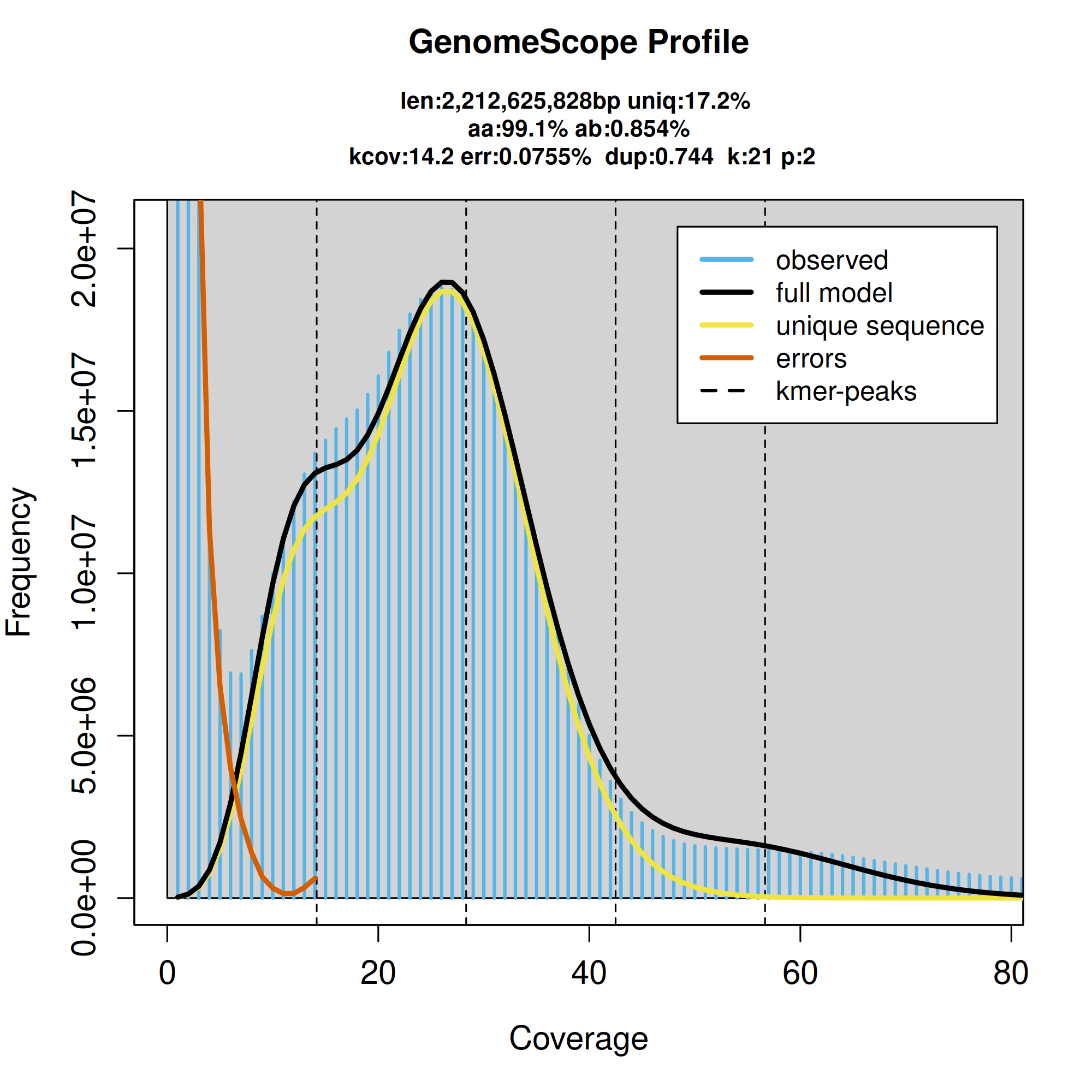 K-mer frequency distribution as a function of coverage. Horizontal bars represent the observed k-mer frequencies, while the curved lines show the GenomeScope model fit and the contributions of unique sequences and sequencing errors. Vertical dashed lines mark estimated k-mer coverage peaks.