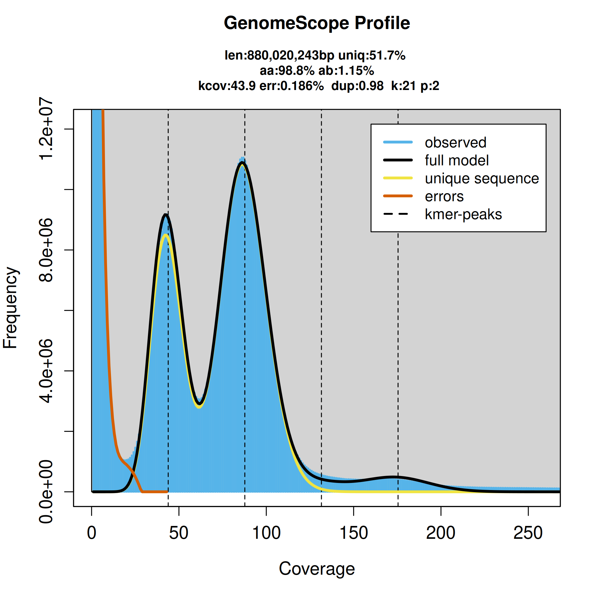K-mer spectra output generated from PacBio HiFi data without adapters using GenomeScope2.0.