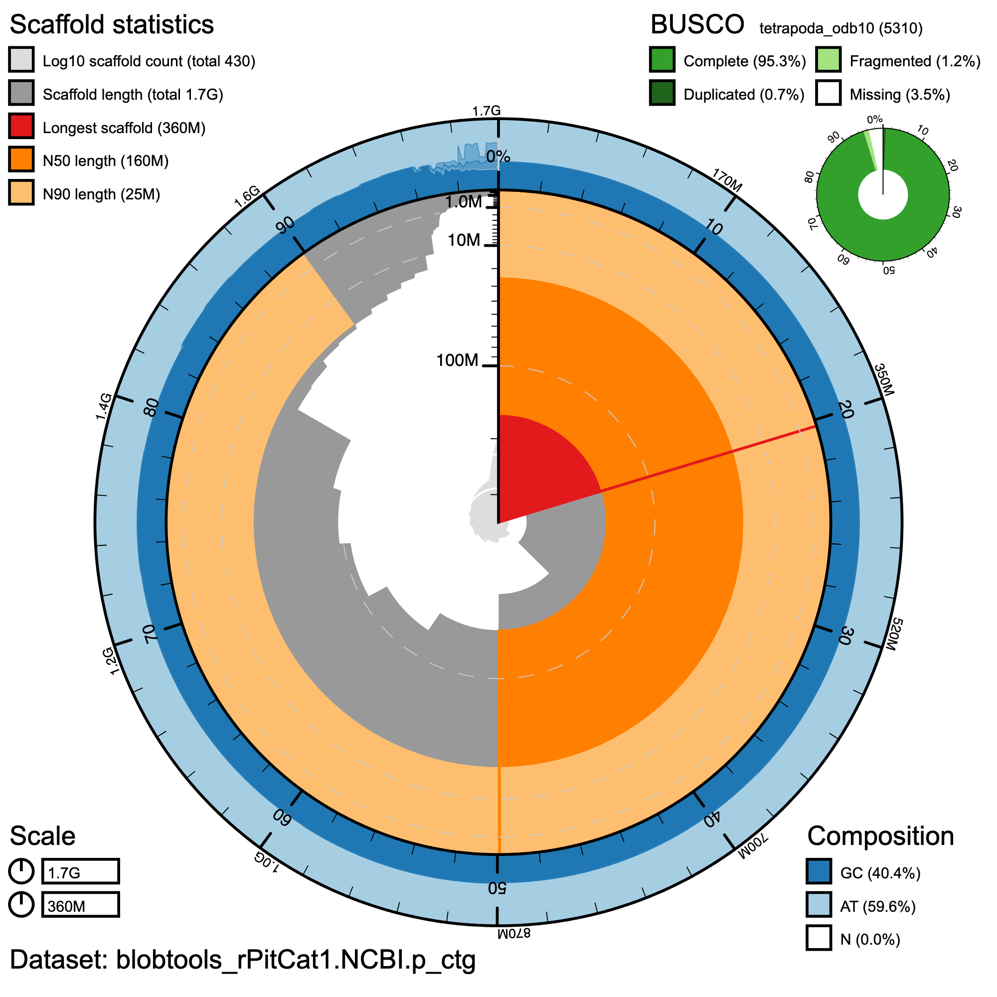 BlobToolKit Snail plot showing a graphical representation of the quality metrics for the primary assembly. The plot circle represents the full size of the assembly. From the inside-out, the central plot covers length-related metrics. The red line represents the size of the longest scaffold; all other scaffolds are arranged in size-order moving clockwise around the plot and drawn in grey starting from the outside of the central plot. Dark and light orange arcs show the scaffold N50 and scaffold N90 values. The central light grey spiral shows the cumulative scaffold count with a white line at each order of magnitude. White regions in this area reflect the proportion of Ns in the assembly The dark vs. light blue area around it shows mean, maximum and minimum GC vs. AT content at 0.1% intervals (Challis et al. 2020)