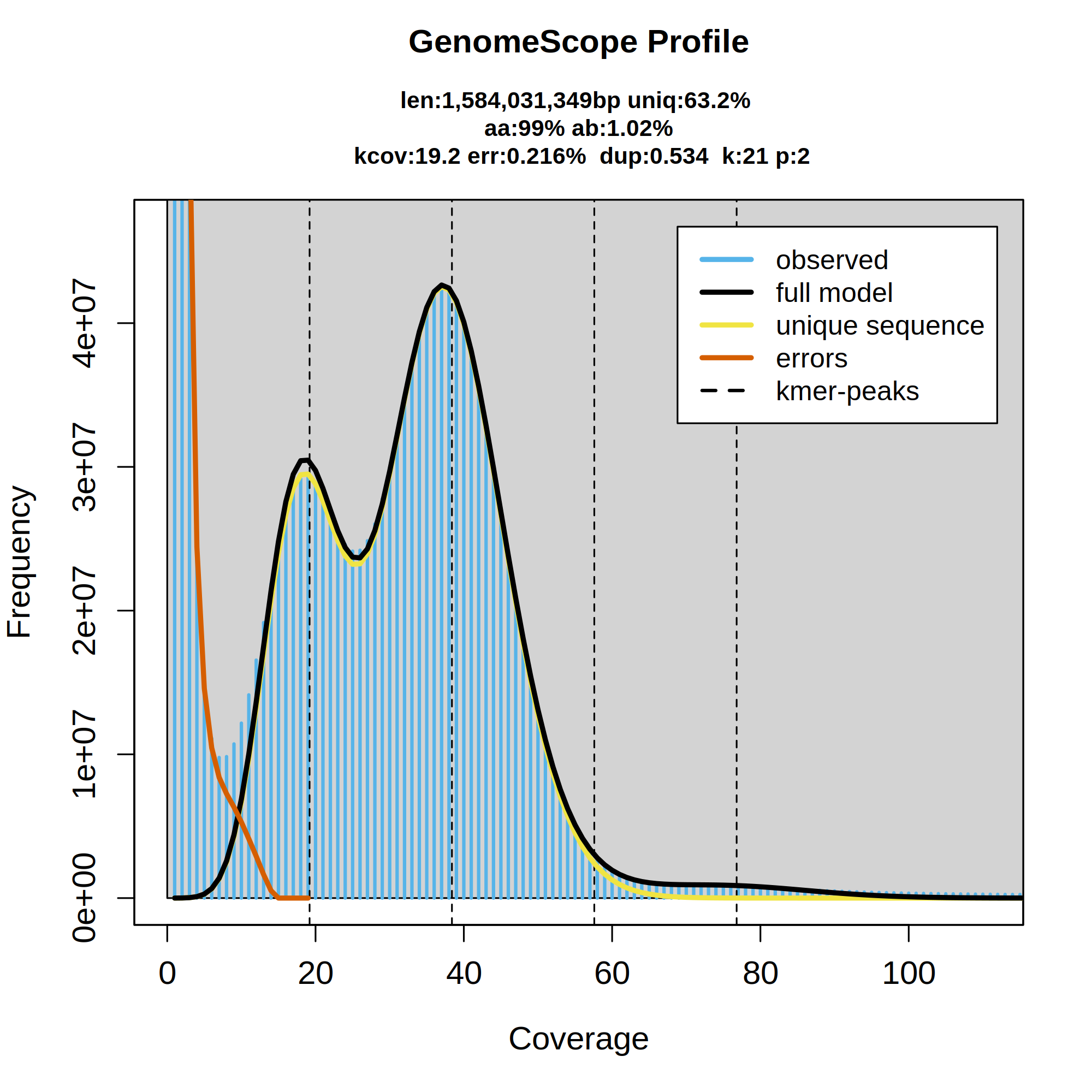 K-mer spectra output generated from PacBio HiFi data without adapters using GenomeScope2.0.