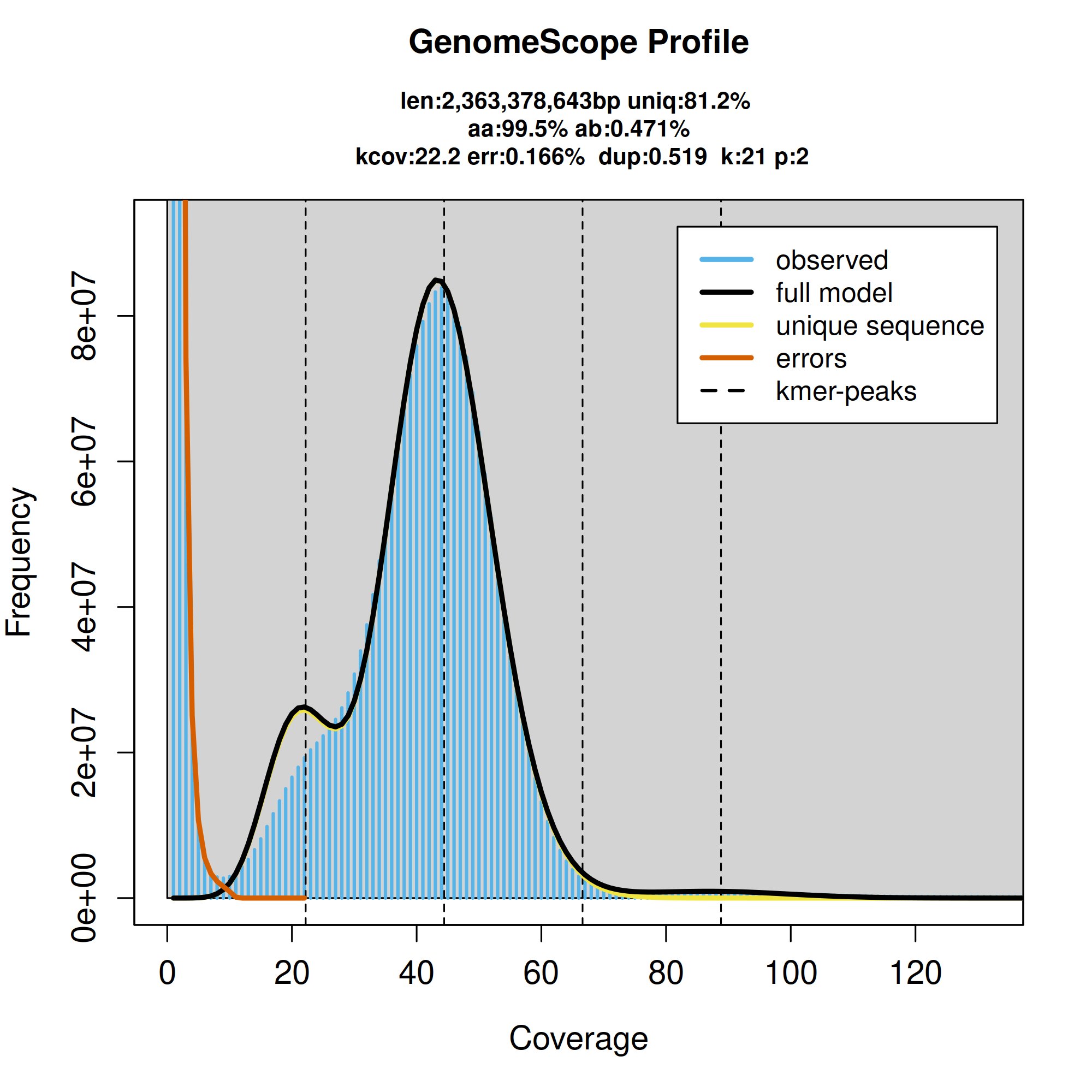 K-mer frequencies from the adapter-trimmed PacBio HiFi data used to estimate genome size, sequencing error rate, and heterozygosity. The main peak at ~44-fold coverage corresponds to homozygous regions of the genome, whereas the peak at ~22-fold corresponds to heterozygous regions of the genome. The peak near zero corresponds to probable sequencing errors.