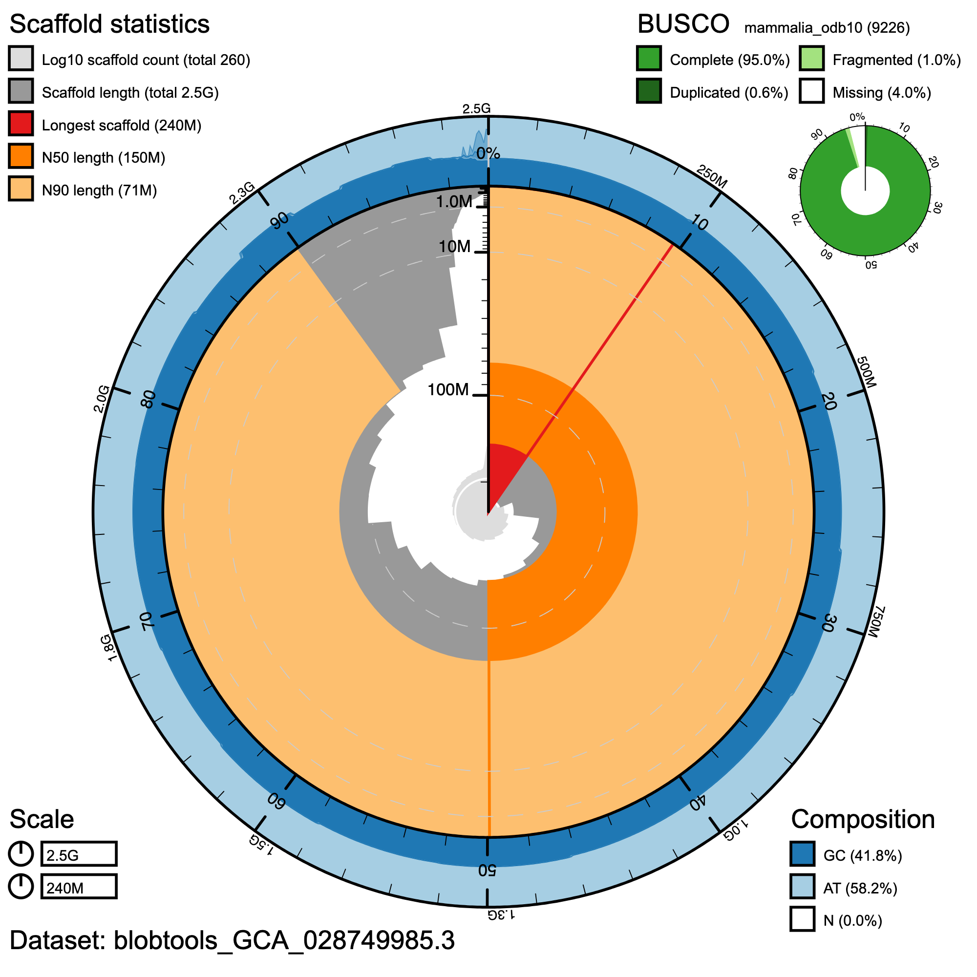 BlobToolKit Snail plot showing a graphical representation of the quality metrics for the primary assembly. The plot circle represents the full size of the assembly. From the inside-out, the central plot covers length-related metrics. The red line represents the size of the longest scaffold; all other scaffolds are arranged in size-order moving clockwise around the plot and drawn in grey starting from the outside of the central plot. Dark and light orange arcs show the scaffold N50 and scaffold N90 values. The central light grey spiral shows the cumulative scaffold count with a white line at each order of magnitude. White regions in this area reflect the proportion of Ns in the assembly The dark vs. light blue area around it shows mean, maximum and minimum GC vs. AT content at 0.1% intervals (Challis et al. 2020)