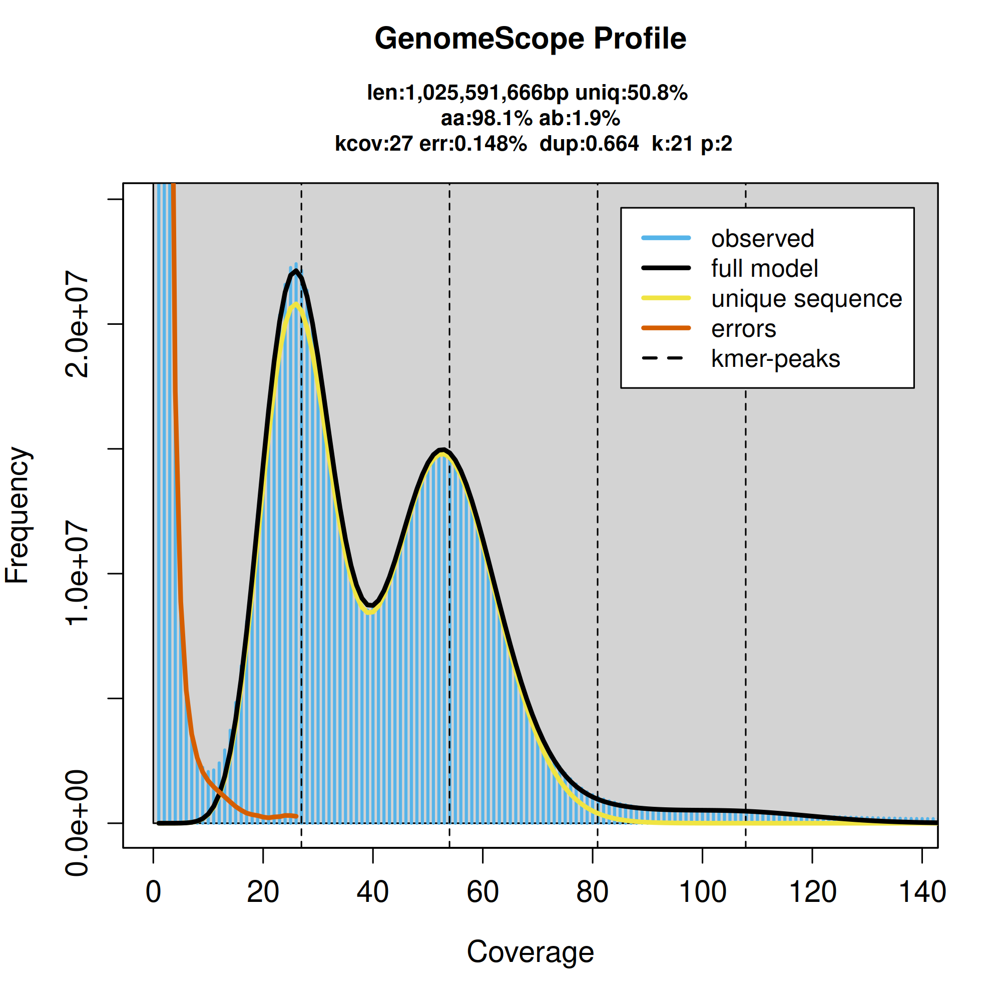 K-mer spectrum output generated from PacBio HiFi data without adapters using GenomeScope2.0. The bimodal pattern observed corresponds to a diploid genome and the k-mer profile matches that of high heterozygosity. K-mers at lower coverage and high frequency correspond to differences between haplotypes, whereas the higher coverage and low frequency k-mers correspond to the similarities between haplotypes.