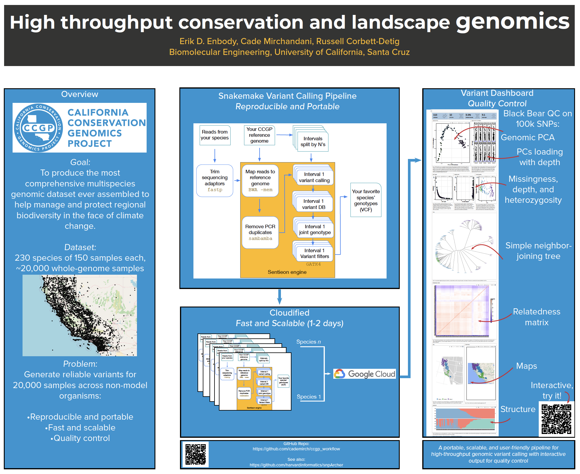 CCGP’s Bioinformatics Postdoc, Erik Enbody, presented a poster titled, “High throughput conservation and landscape genomics”, at the annual UC Santa Cruz Postdoc Symposium on May 24, 2022. The poster outlines the pipeline that he and the rest of the Bioinformatics team (Cade Mirchandani and Russell Corbett-Detig) developed to process and analyze CCGP’s whole genome resequencing data.